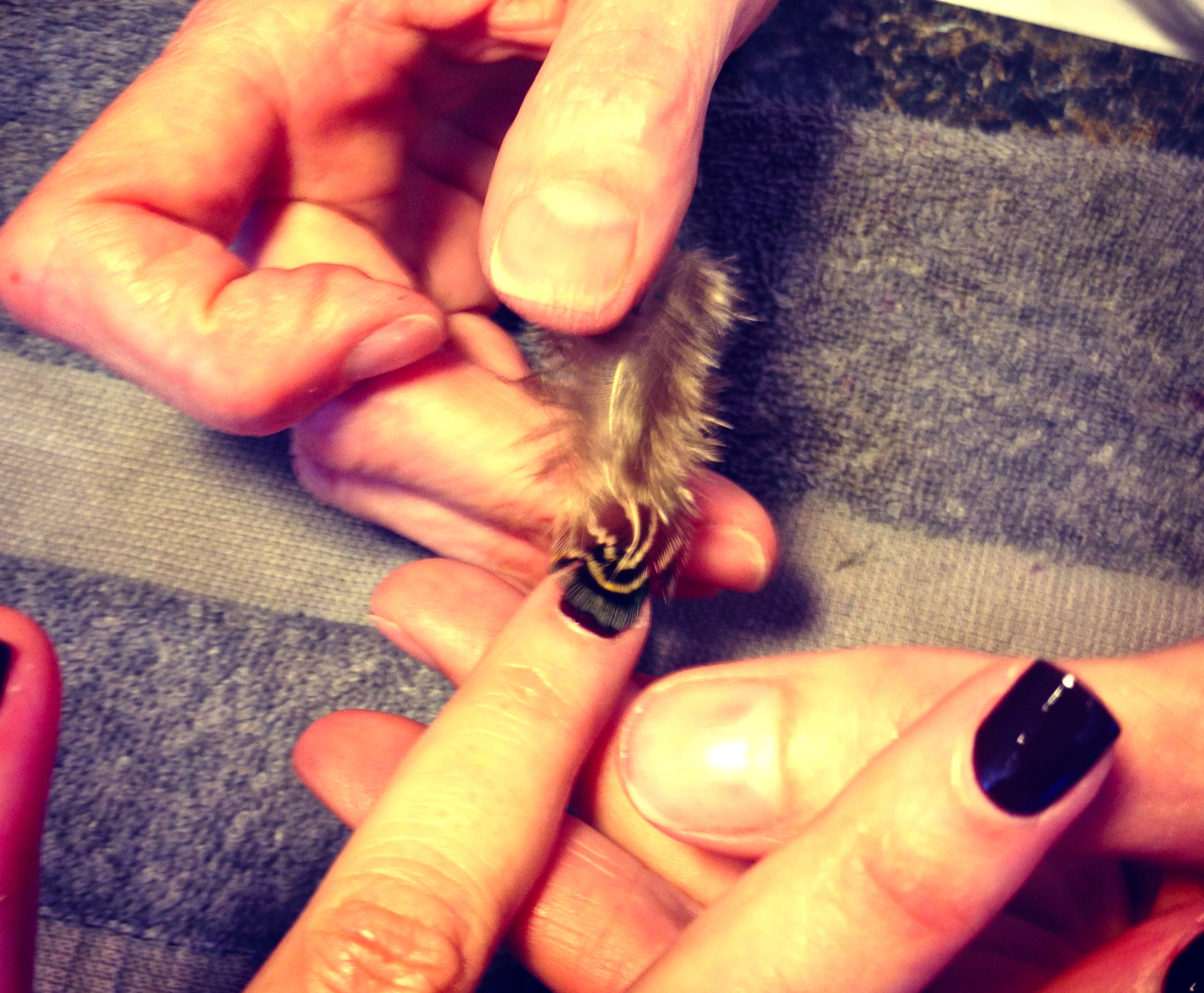 She added a feather accent nail to my bi-monthly manicure. After nails are dry but a little sticky.. she adds a feather ( she gets them at the craft store Im told) and then cuts and shapes to the nail .. then adds a top coat to seal it in.
