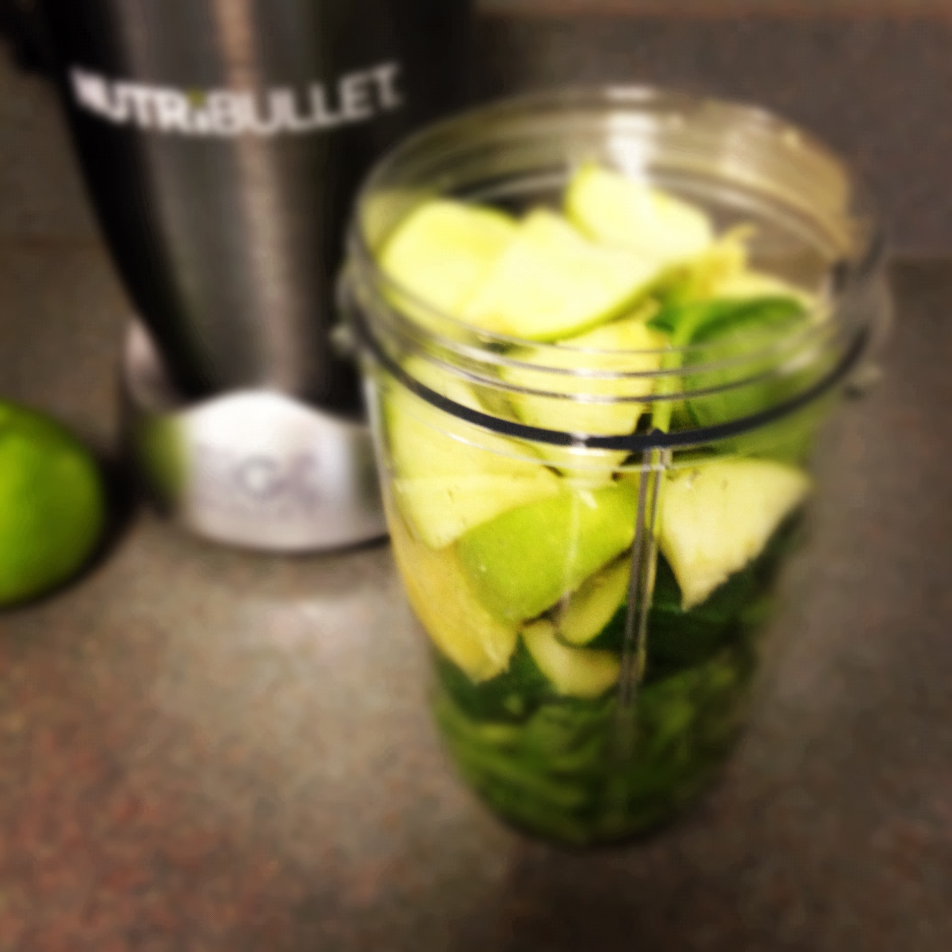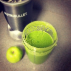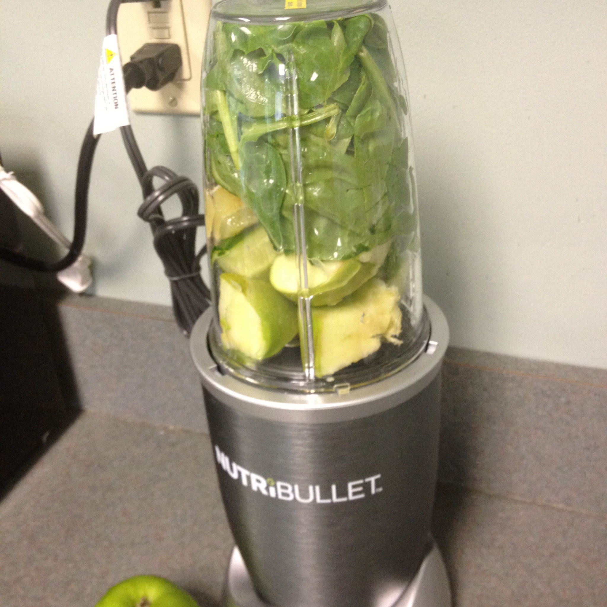 First off .. I stuffed the nutribullet with the apple on top, thinking it would be hardest to blend and closer to the blade.. NO not good.. actually wound up taking the apple out and blending everything sans apple then adding apple back in after the other stuff was blended.. it did blend it all after I did that.. but it was NOT in my opinion juice.. it was a green smoothie… it blended the juice not extracted it ( I did not expect it to be extracted ) it was pulpy ..  and it really tasted NOTHNG like my green lemonade in my Omega.. (that is some serious juice) BUT.. I did like it..  and maybe had I mixed/blended a little longer or added more water it would have been smoother over pulpy.. ??