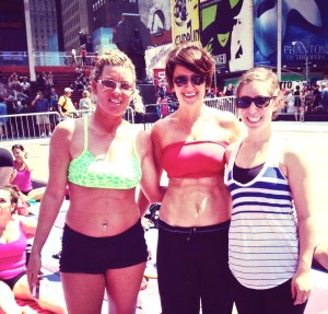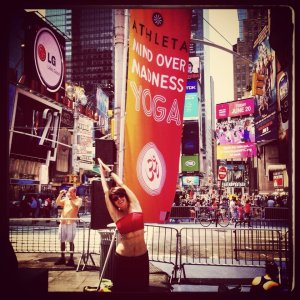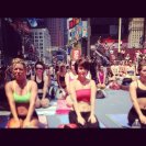 We had a few yogis in front of us who instructed us that we didnt give them enough space .. LOL really??? Some things never change.. even in times square. We were told to have 6 inches between mats .. so we had 6 inches between mats.. sorry confused girls in front of us.. ??