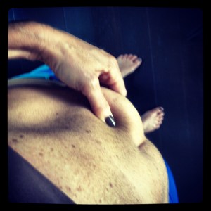 Oh and btw.. yesterday.. I decided to take stats.. 121.8 lbs .. 25% fat .. according to my funky scale.. NOT even sure how that works.. so Im assuming body fat is HIGHER.. and that right there is the reason for this challenge.. I may gain weight / muscle.. but I want to lower my fat .. for my overall health. here is a comparison photo.. first is me 8years ago ( left) ..and me yesterday 7-27-12 ( yes I have the same clothes.. I buy classics for a reason) I may not look like I need to lose weight and I don’t perse…I feel fine.. as I said.. just want to gain muscle to support my overall health.. FAT is not good regardless of what size you wear… here too is a pic of ME yesterday ( 7-27-12).. pinching more then an inch.. and I promise it aint skin.