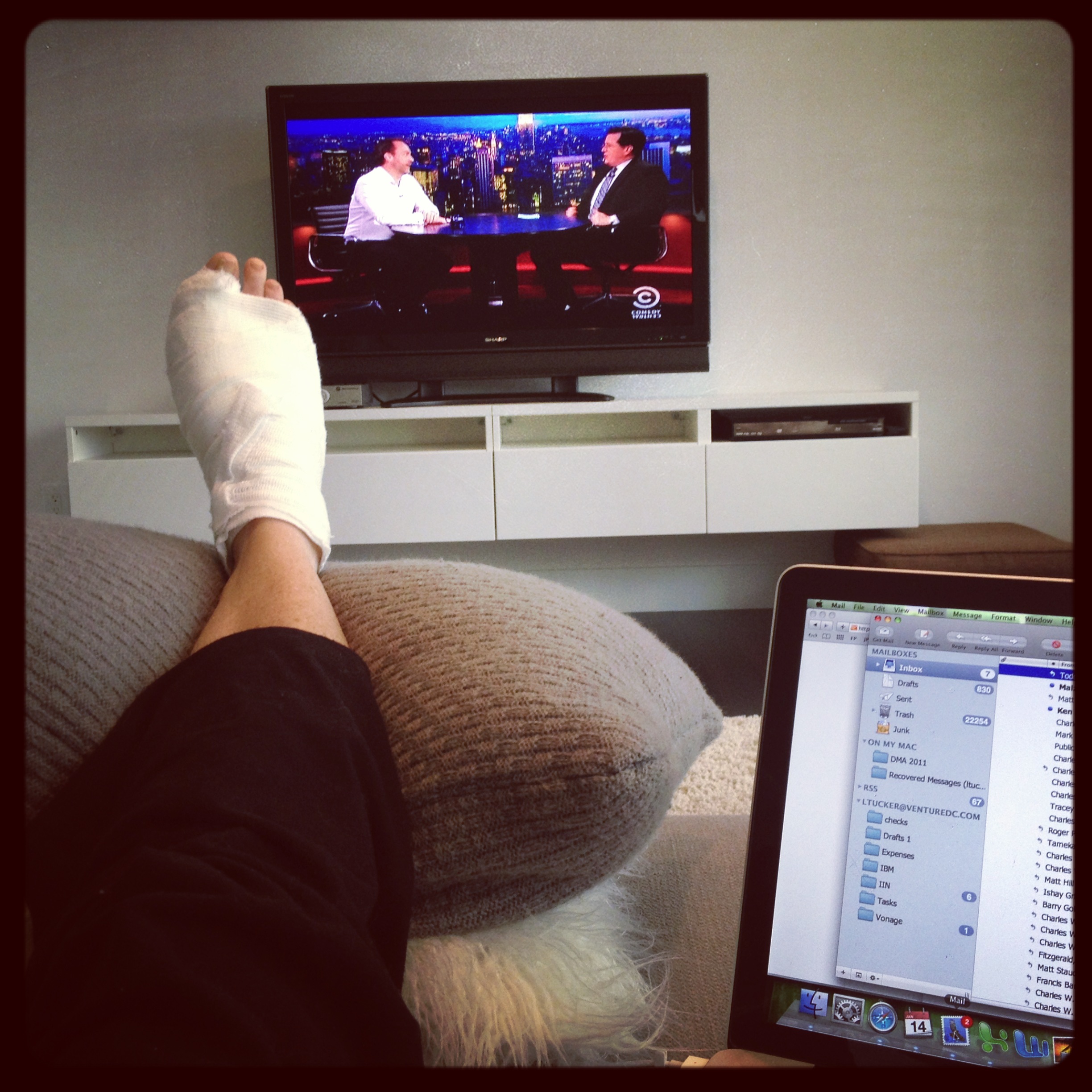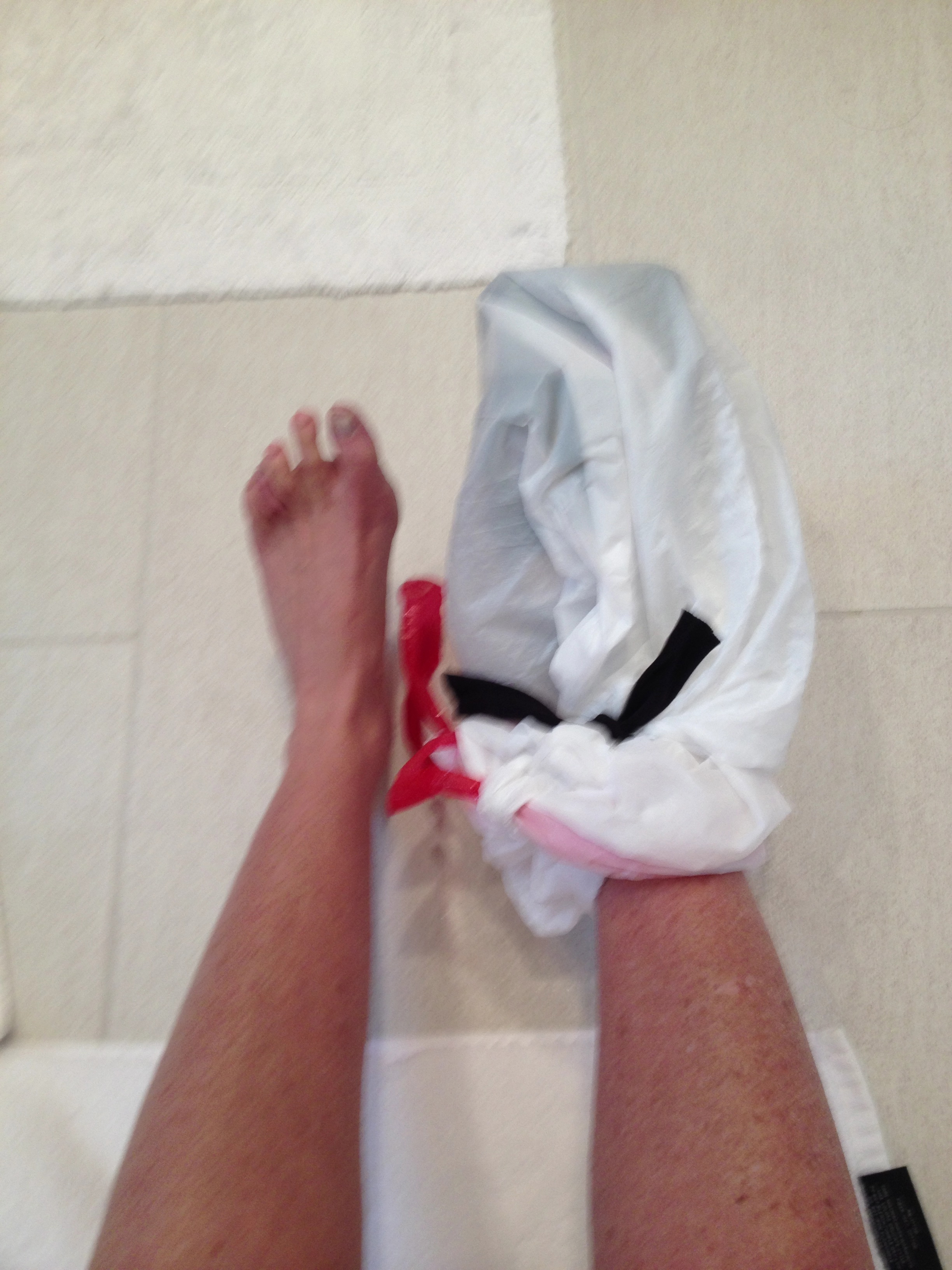 but as crazy as it seems.. I think Im getting use to it.. ? At first glance too , color of my toes looks great.. more pink then purple today. Im NOW in position on my side of the couch in the living area.. where I presume I will stay until I take a bath ( my BF will be helping me ) and then just another day of ‘nothing’. Im staying positive.. and visualizing all the new fun pain free activities I will be doing come April.. Im not going to be hard on myself.. its ONLY day two after surgery.. and in my book.. things ‘look’ promising. (Note : photos – me just doing nothing.. its what I do most of the day and then me in my bath attire/platstic bag) Happy day. and check out my blog post from 1-13-13 regarding my shower experience..