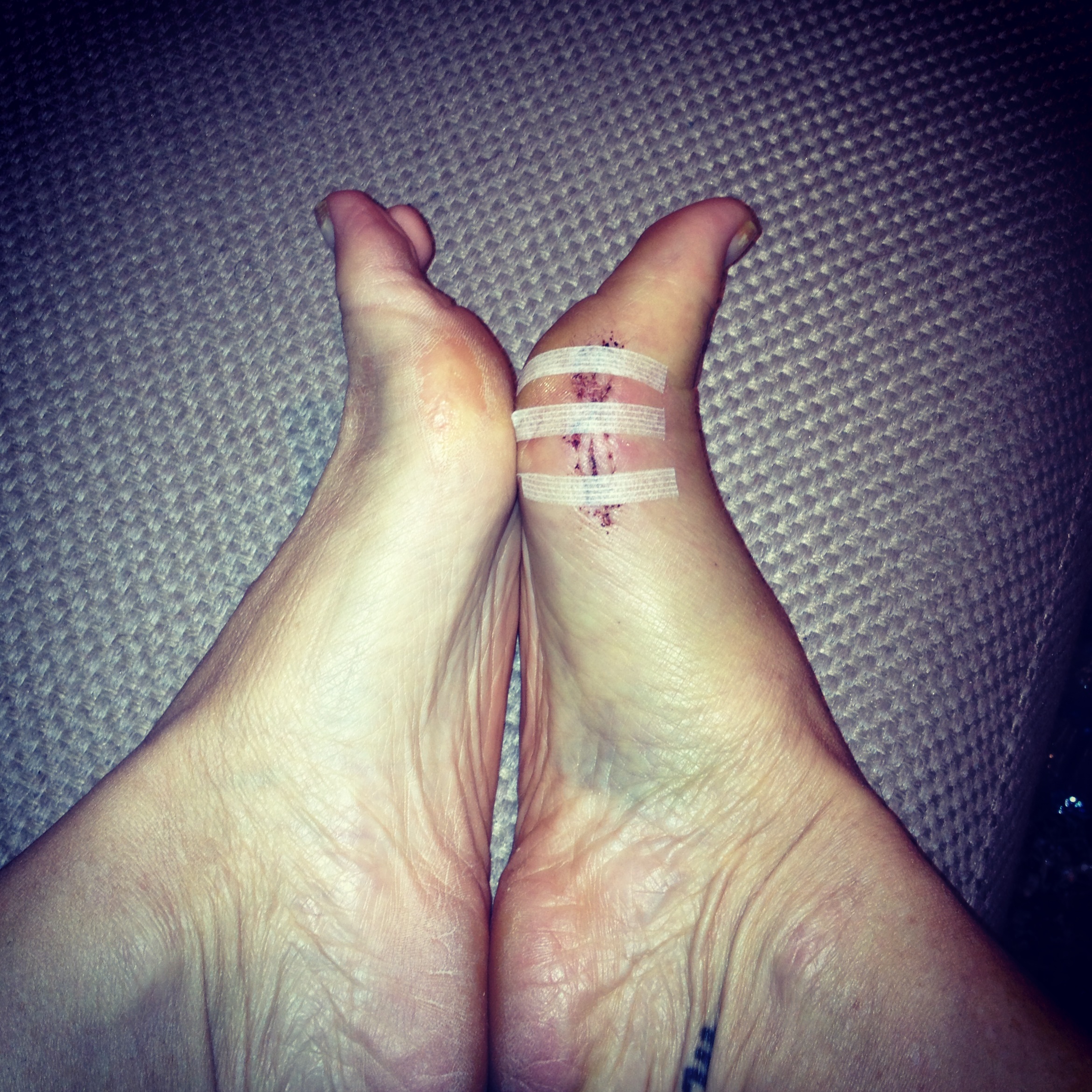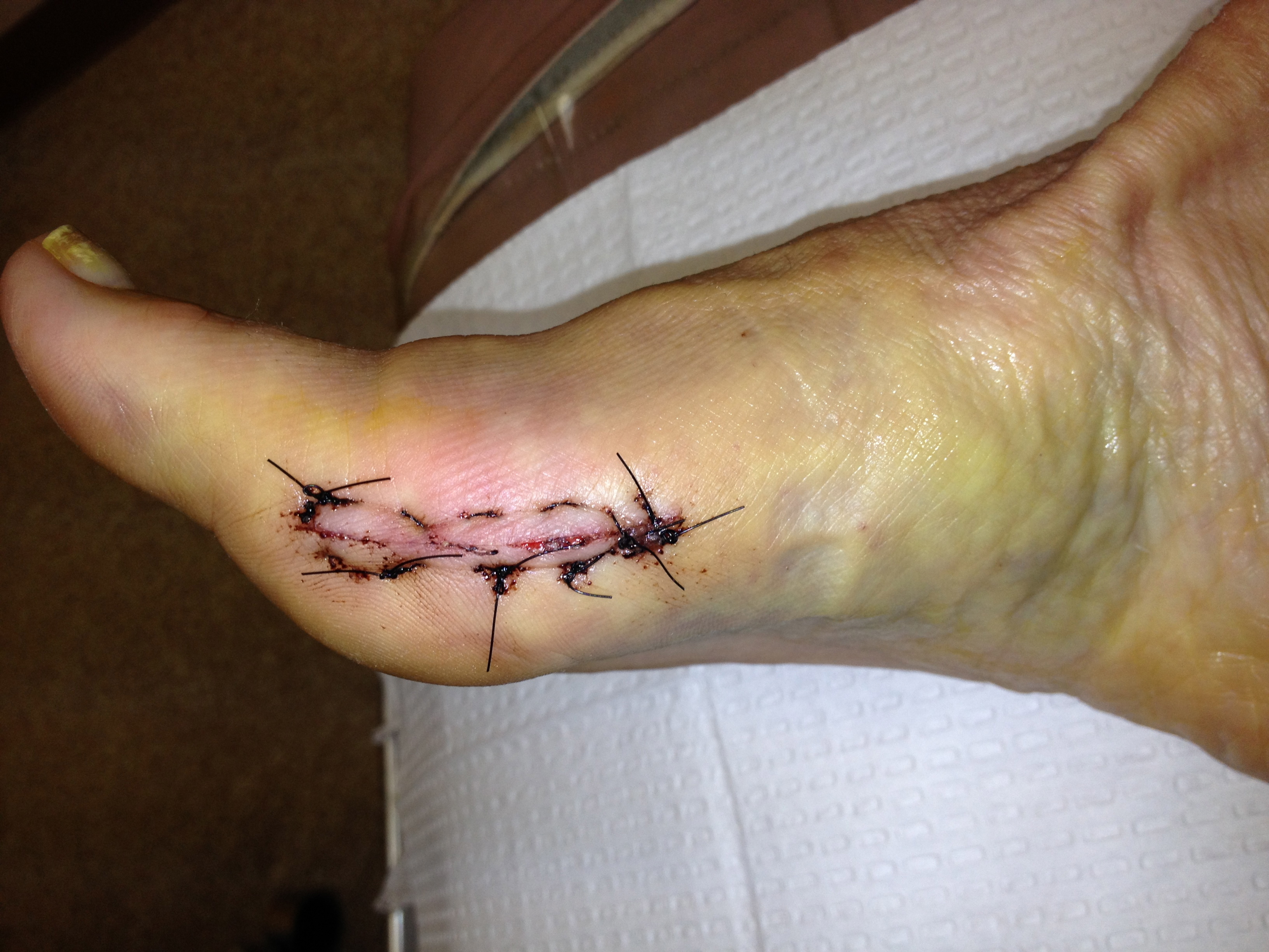 Hellooooooo day I get my stitches out.. Nothing new today.. just a little anxious about feeling any pain when I get my stitches out.. Sat on my butt all day, worked from home, iced my foot.. and then .. around 6pm my honey came home from work and said ” Im ready of you are “.. ummmm ?? really.. ? WELL heck yeah.. Im ready. 6:45 in the Dr’f office.. it IS a good day.. waiting room had only one other person in there.. Im the last appt. and I was sure he would be backed up.. NOPE.. he is on time. In the ‘room’ he undressed the foot ( I admitted to changing the dressing.. as if he didnt know?) and said he was amazed at how great it looked.. he then laid the chair back and then I heard it.. snip, snip, snip.. my stomach flip flopped a bit.. and then a tug.. these babies needed a bit more then a tug and the Dr. knew I was feeling it.. (not horrible.. but not fun either.. I kept saying. no pain, no gain in my head) so he decided to ask me about my recent travels to Mexico.. I looked at my honey and said.. ‘you tell him’ .. .. I had to concentrate of not freaking out. About 5 mins later.. I said.. “all done” ? and he was.. FINALLY.. FREE from bandage, free from stitches.. I am ready to heal. He put a few steri strips on the incision , gave me instruction NOT to peel them off ( he knows me well) and then told me that he wants me to do heel / toe walking.. NO more baby steps on my heel.. which could cause another injury.. I am to put full weight on my foot.. We left the office and all I could think about was taking a shower.. tomorrow. At home, I iced my foot (still need to continue till swelling is gone) and went to sleep without my bandage.. slept okay, not great.. Im still more than aware of my foot.