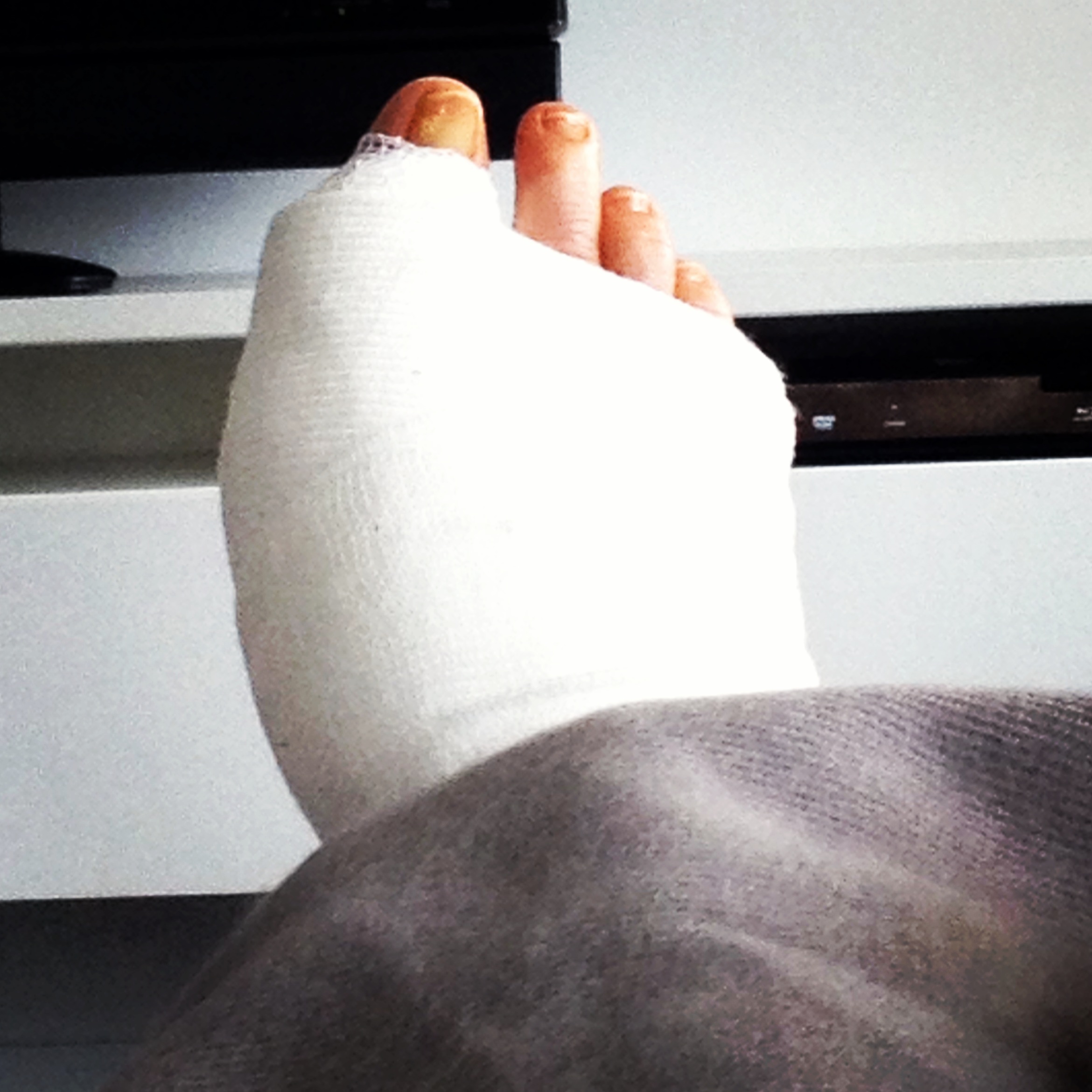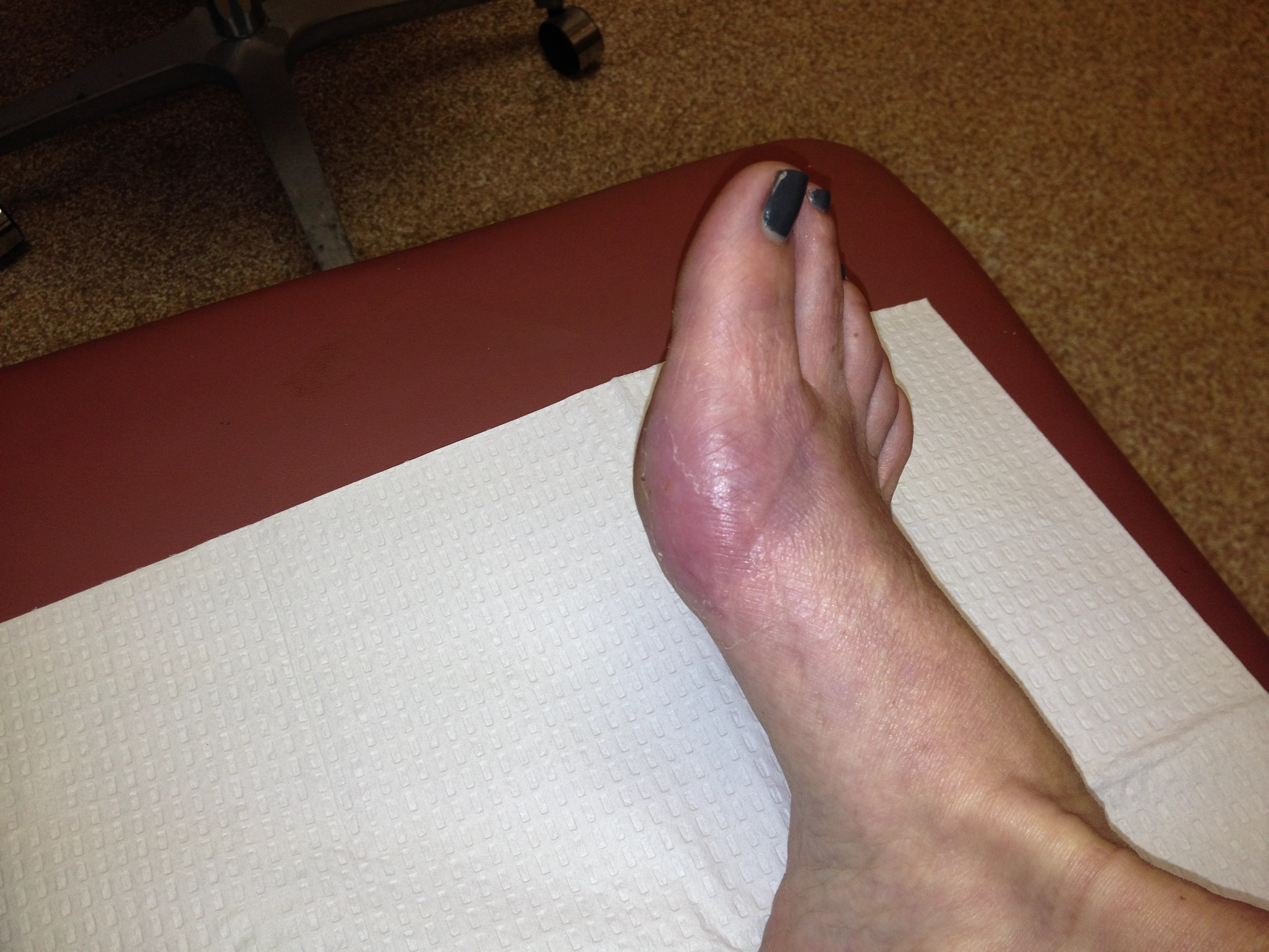 Around 3am I felt my foot.. YEP.. I felt it .. as in it was no longer numb.. uh oh.. but I talked myself back to sleep and just repositioned the foot a little.. 5am. .I had to tinkle.. so I put on the walking boot.. and thought Id just hobble over to the bathroom as I kind of did last nite.. (when I was numb).. OMG.. the pain I felt as soon as my foot went down was so incredible that I began to sweat, felt faint and yes.. had to throw up.. by that time my BF woke up and helped me in to the bath room where I just about collapsed.. NOT FUN.. my BF gave me more toridol and helped me back to bed.. brought me ice for my foot and water to drink.. I slept another two hours.. by the time I woke up the toridol had started to work ( toridol is a VERY strong anti inflammatory) and my BF also brought me crutches ( thank goodness I borrowed them from my nephew) so I didn’t have to even attempt to put the foot down…. . seriously.. not sure what they think about that.. as if I can walk? LOL .. Fast forward.. Im relaxing today.. granted in a bit of pain (think constant throbbing blood flow in your foot) and not so comfortable .. but I had a visitor for lunch and Im feeling clear headed (NO pain meds allows for that).. which is good. yesterday I felt loopy for most of the day. Icing 4 times a day.. taking antibiotic twice a day.. and toridol three times.. I have oxi’s just in case.. but.. because I always have reactions from pain meds.. I dont want to take any if I can help it.. Id rather drink wine.. which I plan on doing shortly. 🙂 Day two of healing almost in the books.. Oh.. and the swelling has gone down significantly from yesterday.. second toe is no longer touching the big toe… looks almost normal. More to come..