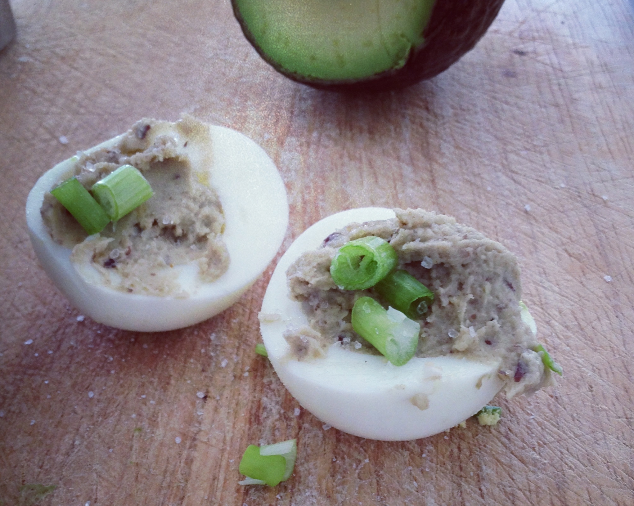 Spoon about a tsp or more into each half of egg white.. garnish with green onion and a sprinkle of salt to taste..